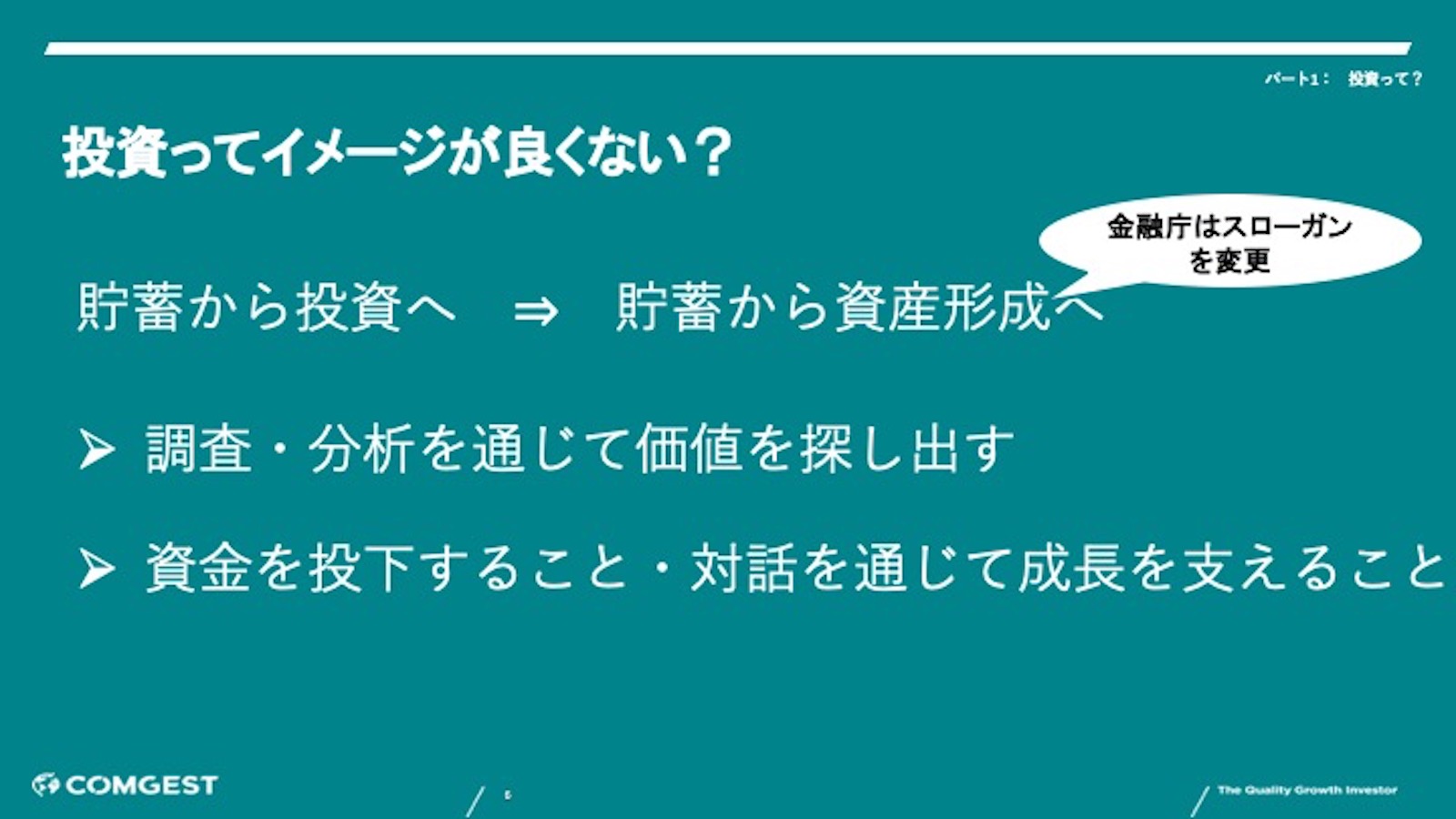 本日のセミナーでは、⑴投資の正しい理解とは、⑵運用会社の役割とは、⑶コムジェストの投資事例、以上の3点についてお話しさせていただきます。