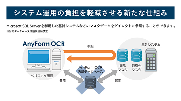具体的には、従来バージョンではAnyForm OCR内にマスタ情報を保存する場合、基幹システムなどのデータベースをエクスポートし、AnyForm OCRにインポートする必要があったが、新バージョンではMicrosoft SQL Serverのデータベースと直接連携することができるため、マスタ情報を同期するための手間が不要となった。今後、対応データベースは順次追加していく予定。
