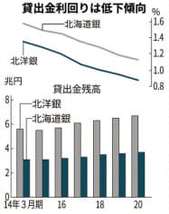 低下が続いてきた地銀の貸出金利回りにも歯止めがかかるかもしれない。2020年3月期の利回りは北海道銀が前の期比0.06ポイント減の1.12%、北洋銀が同0.07ポイント減の0.87%まで下がった。長引く低金利にくわえ、企業の資金需要が低下して低利回りの自治体向け融資が増えていた。
