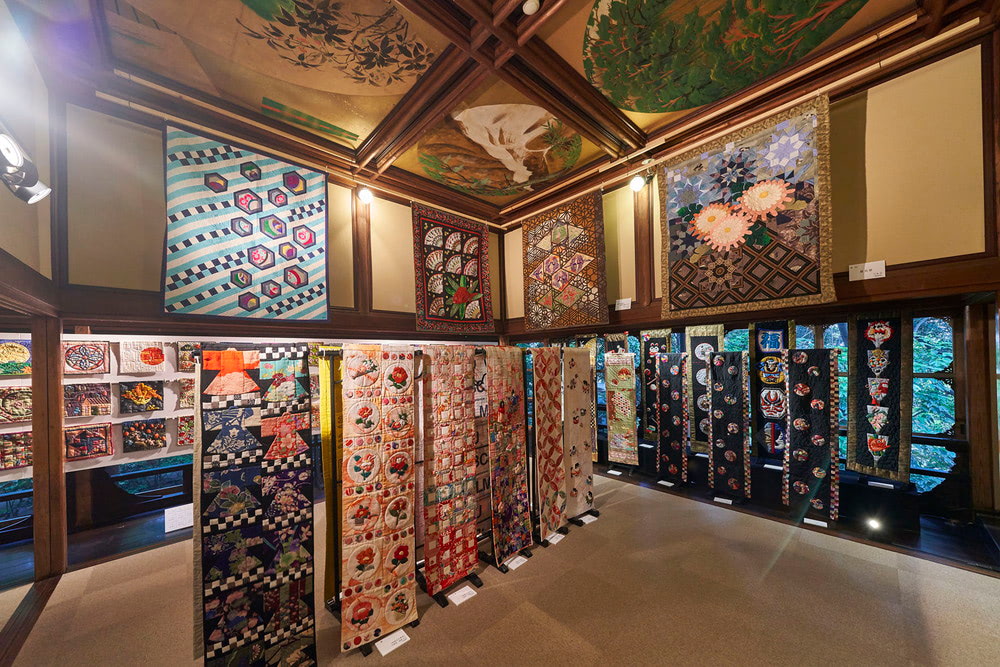 海外でも年々認知の高まりを見せる和キルトの世界だが、今年は日常が様変わりする中、吉祥文様など幸せを願う日本の感性が表現された作品が多く集まった。そのほか、この企画展のために2年もの歳月をかけて制作された45名の作家による新作を含む100点を超える作品が展示される様子はまさに壮観。今年も写真撮影が可能なので、百段階段の持つ絢爛豪華かつ伝統的な空間と温かな和キルト作品のコラボレーションをお愉しみいただきたい。