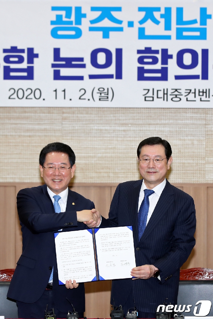 (광주=뉴스1) 황희규 기자 = 김영록 전남도지사(왼쪽)와 이용섭 광주시장이 2일 광주 서구 김대중컨벤션센터에서 열린 광주·전남 행정통합 논의 합의문 서명식에서 서명을 마친 뒤 합의문을 들어보이고 있다. 2020.11.2/뉴스1