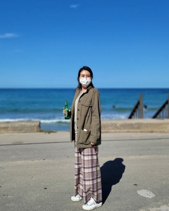사진에서 최정윤은 야상재킷에 체크(바둑판) 무늬 팬츠로 편안한 패션을 선보였다. 그는 한 손에 맥주 한 병을 들고 밝은 모습을 보이고 있어 눈길을 끈다.