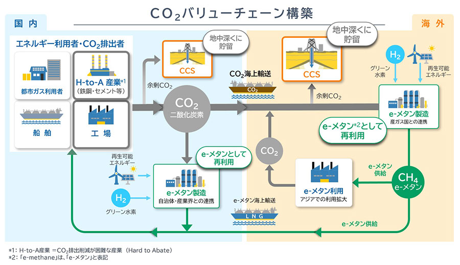 この中では、CO2排出削減が困難な鉄鋼・セメント・化学などの産業から大気中に排出されるCO2を回収し、メタネーションによりe-methaneとして再利用することや、余剰CO2を地中深くに圧入・貯留することで、お客さまのCO2排出量を削減し、環境負荷を低減する循環型社会に貢献することを宣言しています。