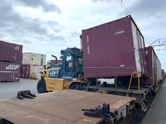 今回、日本貨物鉄道株式会社(JR貨物)(本社:東京都渋谷区、社長:犬飼新)、全国通運株式会社(本社:東京都中央区、社長:永田浩一)および江藤産業株式会社(本社:大分県大分市、社長:近藤寛)の協力で、輸送経路の大半をトラックから鉄道に切り替えるモーダルシフト(※2)により、1回の輸送(大分県玖珠郡九重町~兵庫県神戸市の現場の片道)にかかるCO2排出量を0.347tから0.062tに8割以上の削減を達成しました。