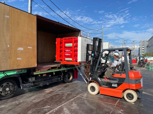 「岩谷産業研修施設新築工事」の建設現場に到着した水素