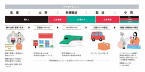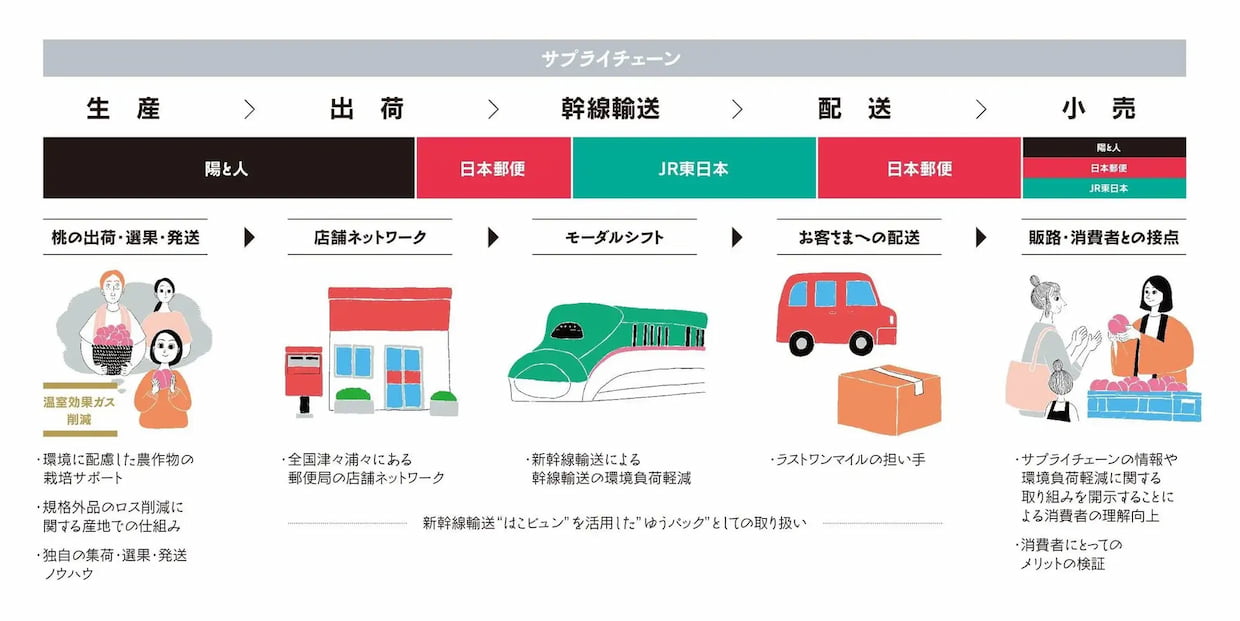 陽と人がプロジェクト企画と商品販売を、日本郵政グループが福島駅までの配送と東京駅からの配送、商品販売を、JR東日本グループが福島駅から東京駅間の輸送と商品販売を受け持つ。